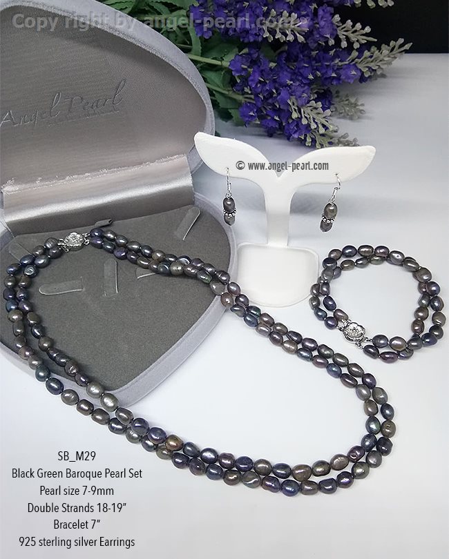 ชุดเครื่องประดับไข่มุกแท้สีดำเขียวทรงบาร์ร็อค สองสาย