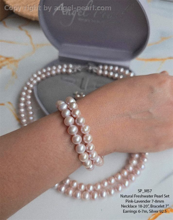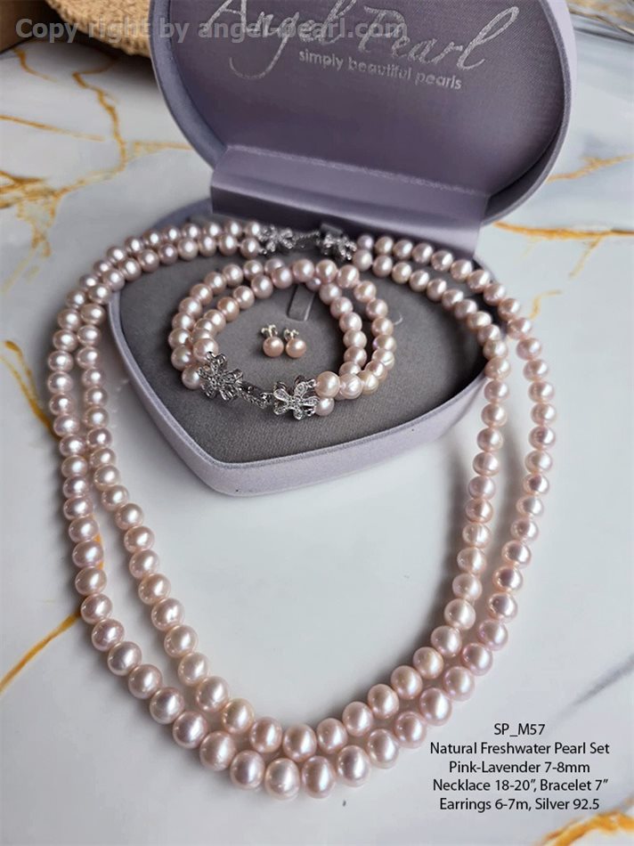 ชุดเครื่องประดับไข่มุกแท้สีลาเวนเดอร์ สองสาย 7-8mm