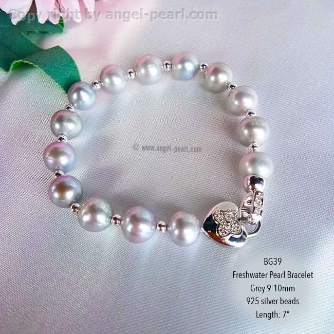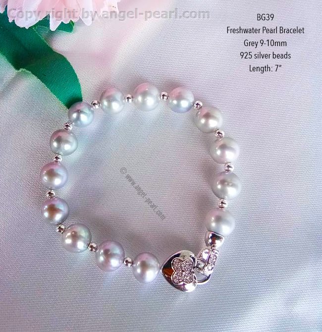 สร้อยข้อมือไข่มุกแท้สีเทาเงิน 9-10mm คั่นเม็ดเงินแท้