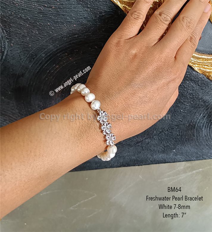 สร้อยข้อมือไข่มุกแท้ สีสวยธรรมชาติ น้ำงาม เงาวาว แต่งจี้ดอกไม้น่ารัก มีรอยธรรมชาติเล็กน้อย